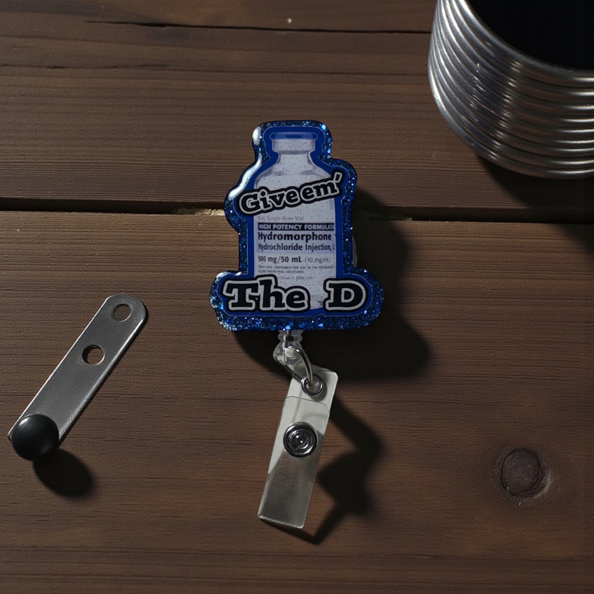Dilaudid Badge Reel – Funny Nurse Badge Clip, “Give ‘Em the D” Reel, ICU ER RN Humor Gift, Medical Badge Holder