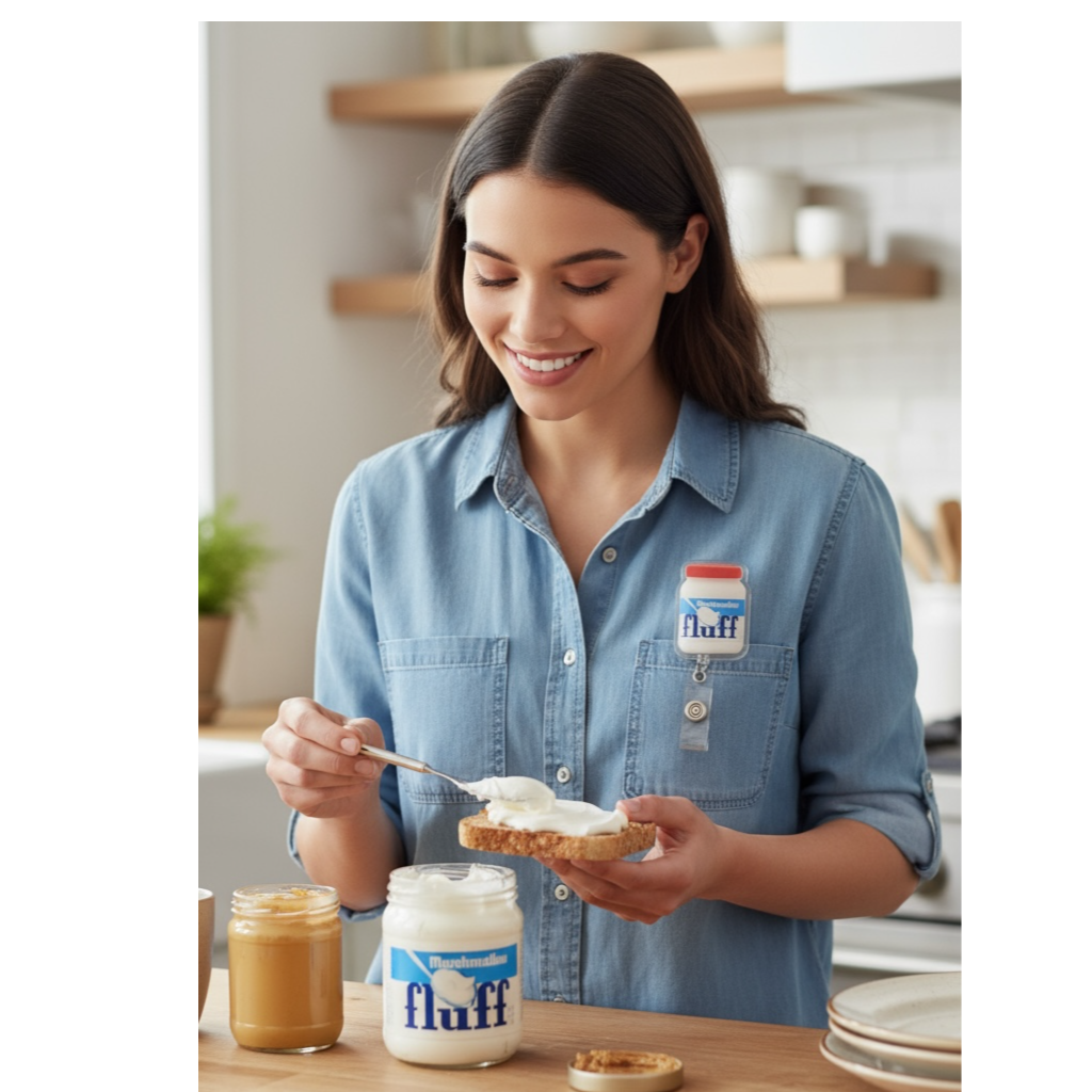 Bring a little sweetness to your shift with this Marshmallow Fluff badge reel! Shaped like the iconic fluffy jar, this retractable ID holder adds a dash of nostalgia and fun to your everyday workwear. Perfect for nurses, doctors, teachers, or anyone who needs to keep their badge handy, this reel is both practical and playful.