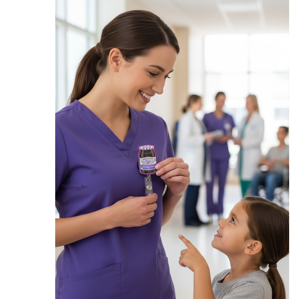Show off your sweet side with this Concord Grape Jelly badge reel! Shaped like the classic Smucker’s jar, this retractable ID holder brings a nostalgic twist to your everyday badge wear. Whether you’re a nurse, teacher, or anyone who needs quick access to an ID, this reel blends function with fun.