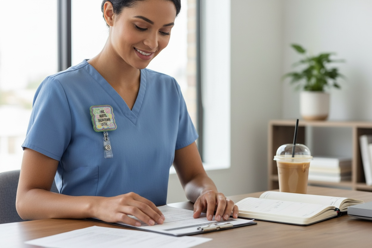 Featuring a playful 90s-inspired flower design with bold black lettering, this handmade badge reel adds personality to any scrub top, lanyard, or work badge. The soft green glitter border gives it that extra pop without being over-the-top.