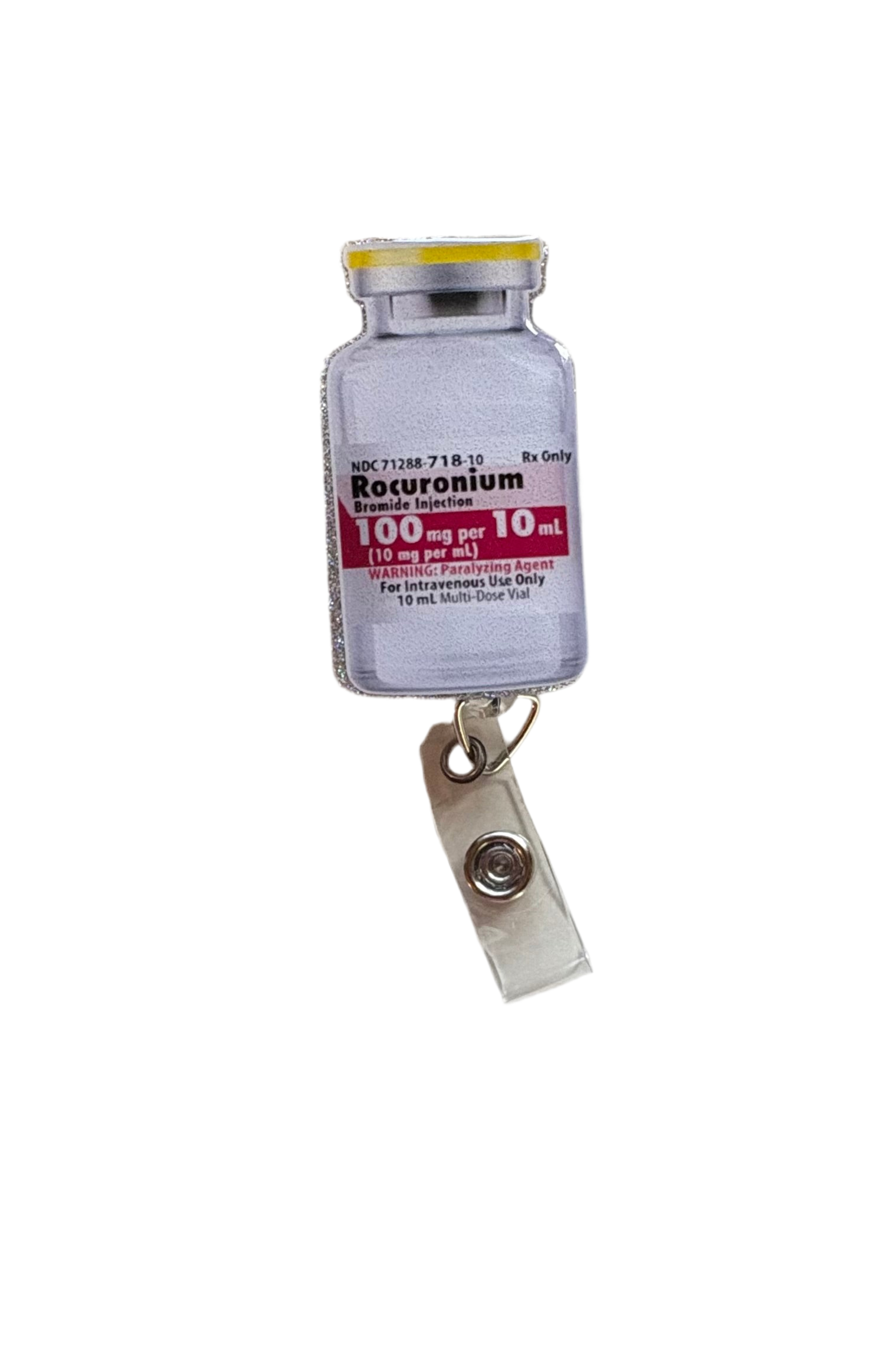 Add some anesthesia humor to your scrubs with this Rocuronium-inspired badge reel! Shaped like a classic vial, this reel is a playful nod to the OR, ER, ICU, and all the places where anesthesia folks work their magic. It’s the perfect mix of functional and funny—keeping your ID secure while showing off your personality.
