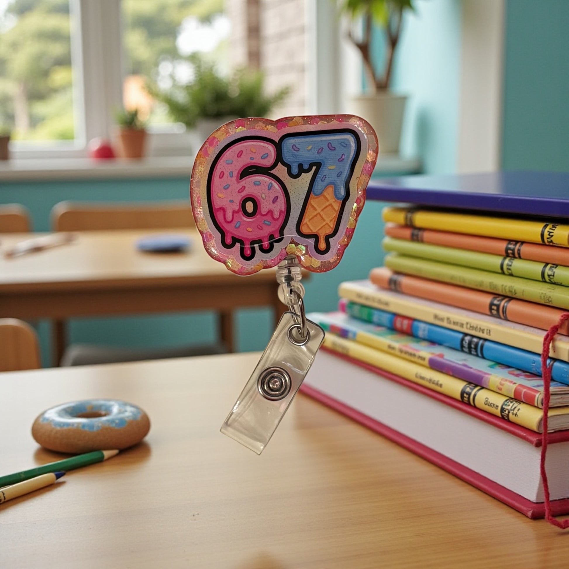 Bring a little classroom nostalgia to your workday with this playful “Six Seven” badge reel. Inspired by the classic composition notebook and decorated with school-supply icons, it’s the perfect accessory for any teacher who hears those numbers shouted down the hallway on repeat.