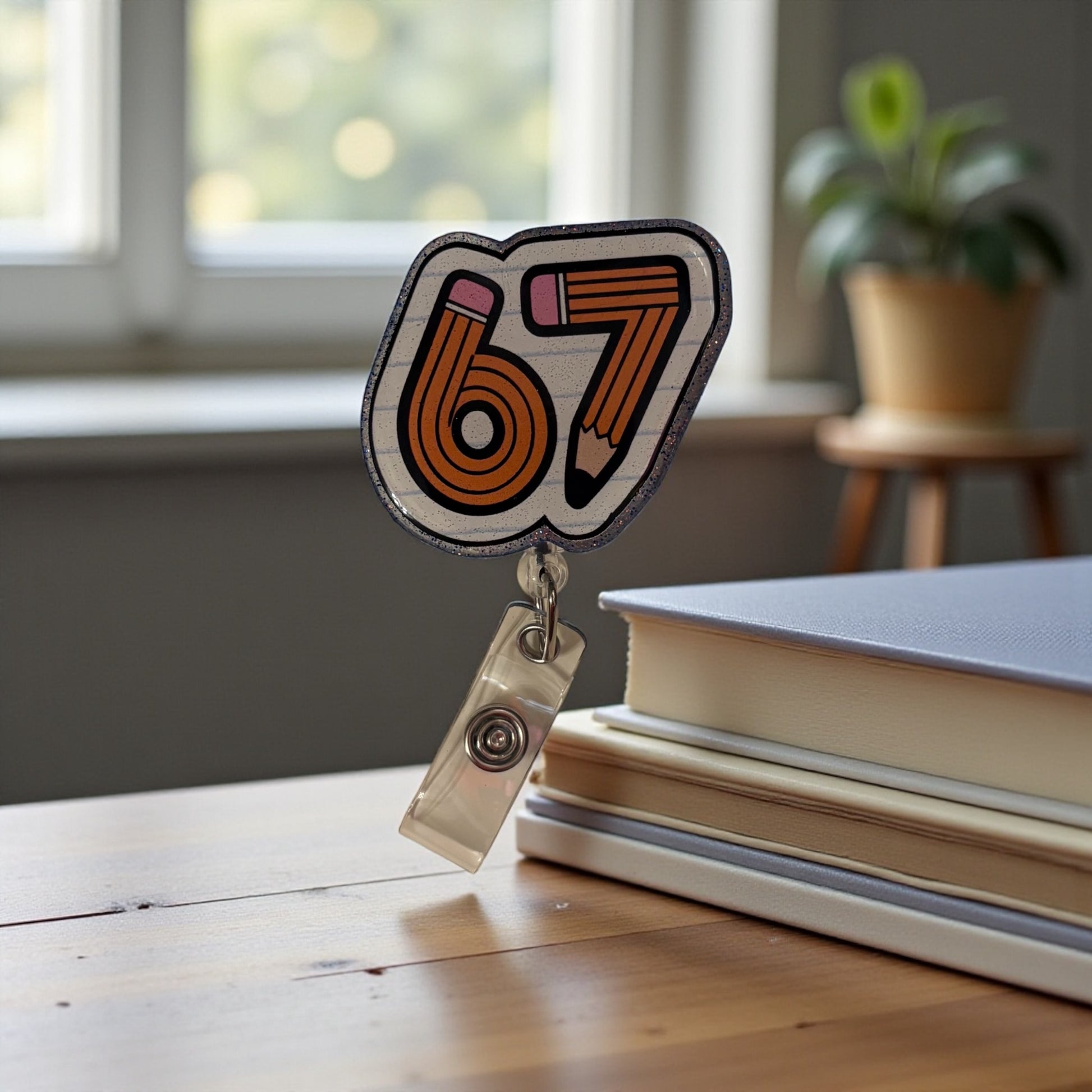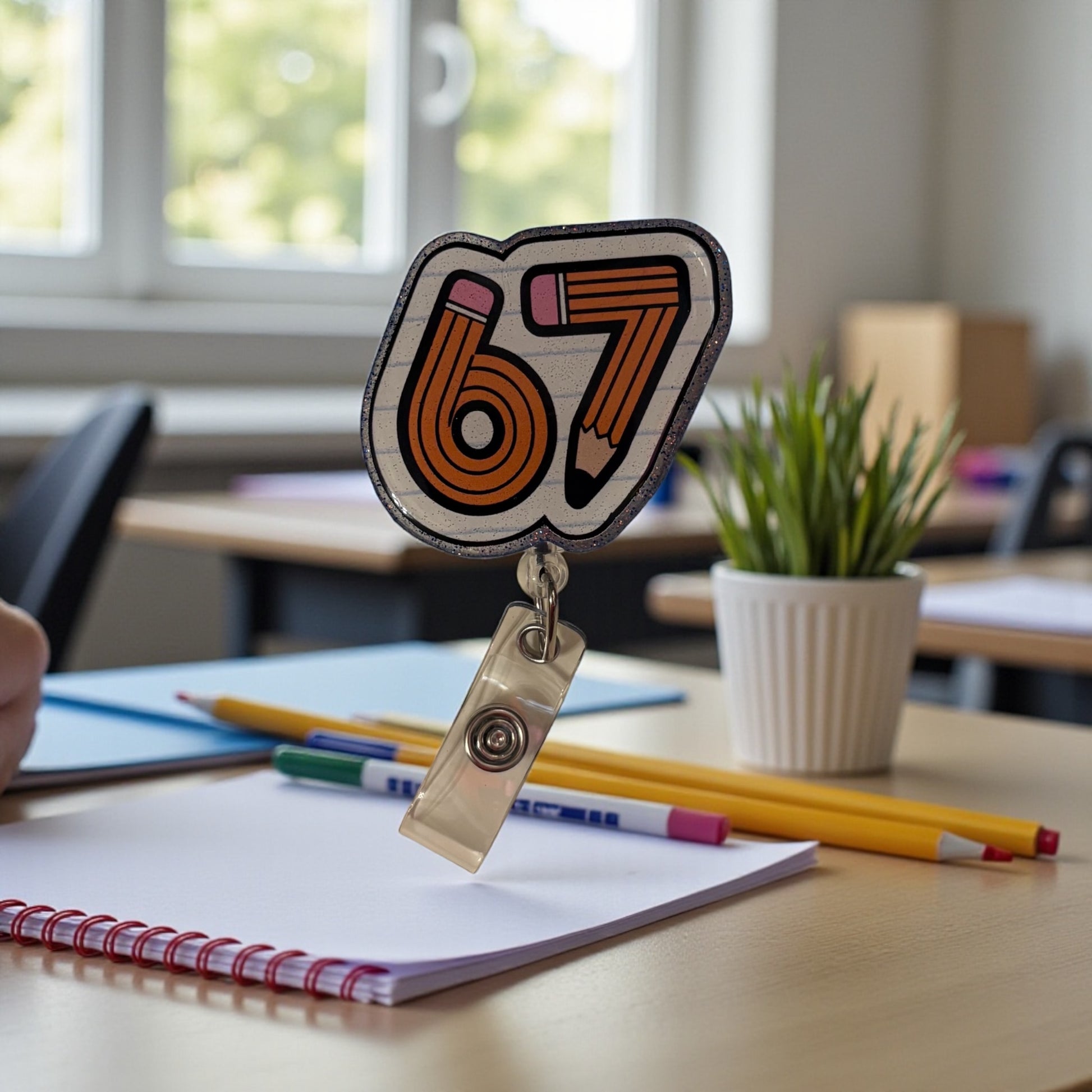 Bring a little classroom nostalgia to your workday with this playful “Six Seven” badge reel. Inspired by the classic composition notebook and decorated with school-supply icons, it’s the perfect accessory for any teacher who hears those numbers shouted down the hallway on repeat.