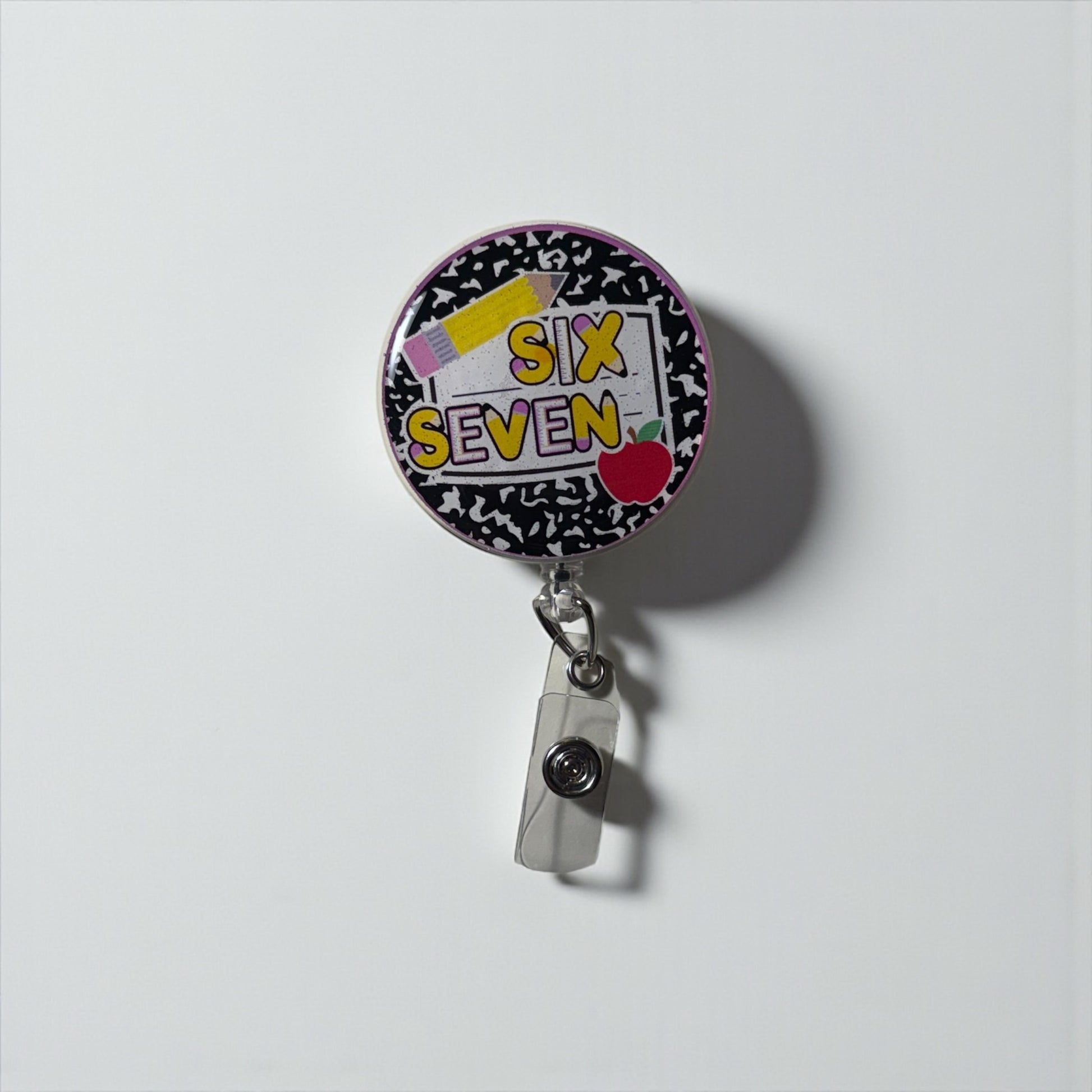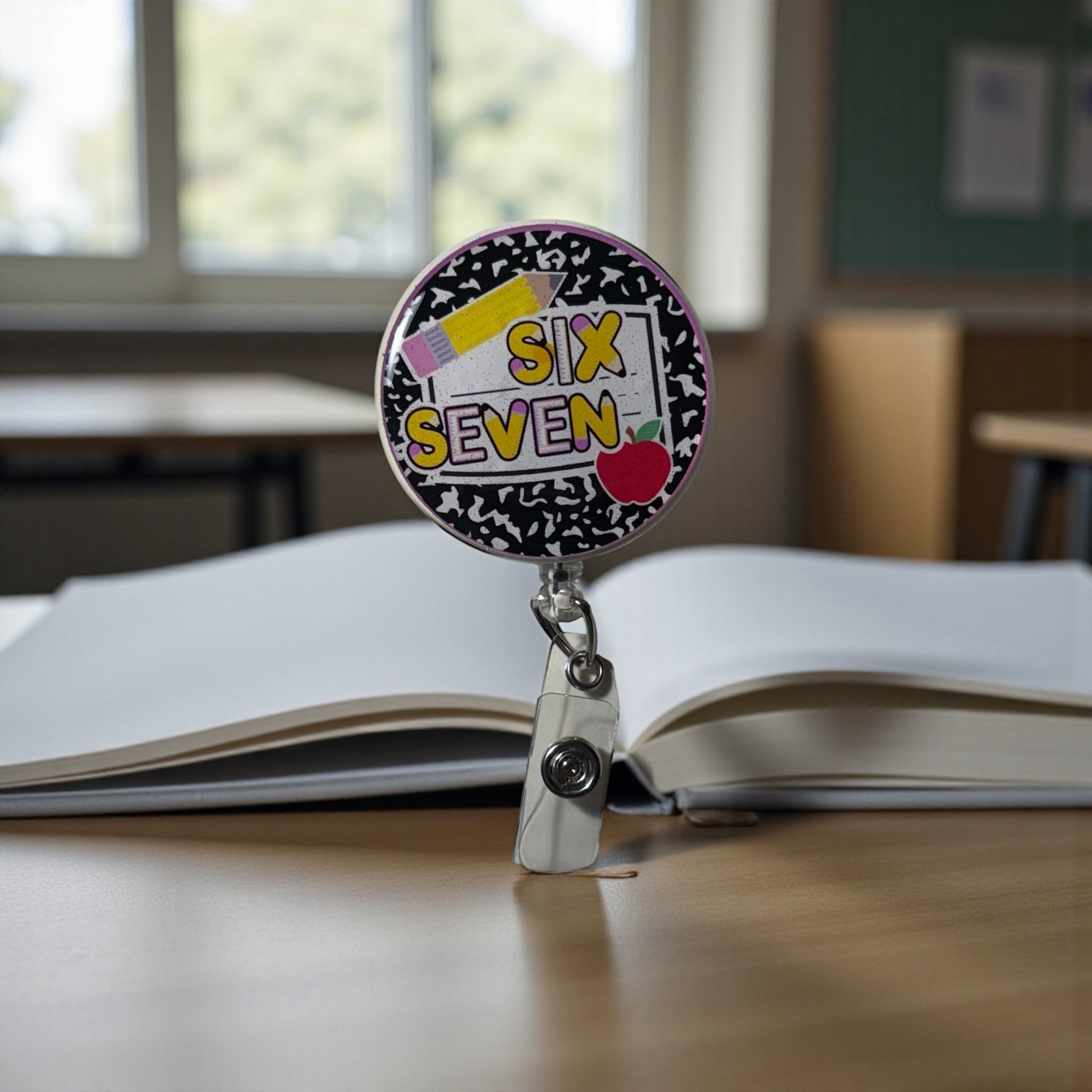 Bring a little classroom nostalgia to your workday with this playful “Six Seven” badge reel. Inspired by the classic composition notebook and decorated with school-supply icons, it’s the perfect accessory for any teacher who hears those numbers shouted down the hallway on repeat.