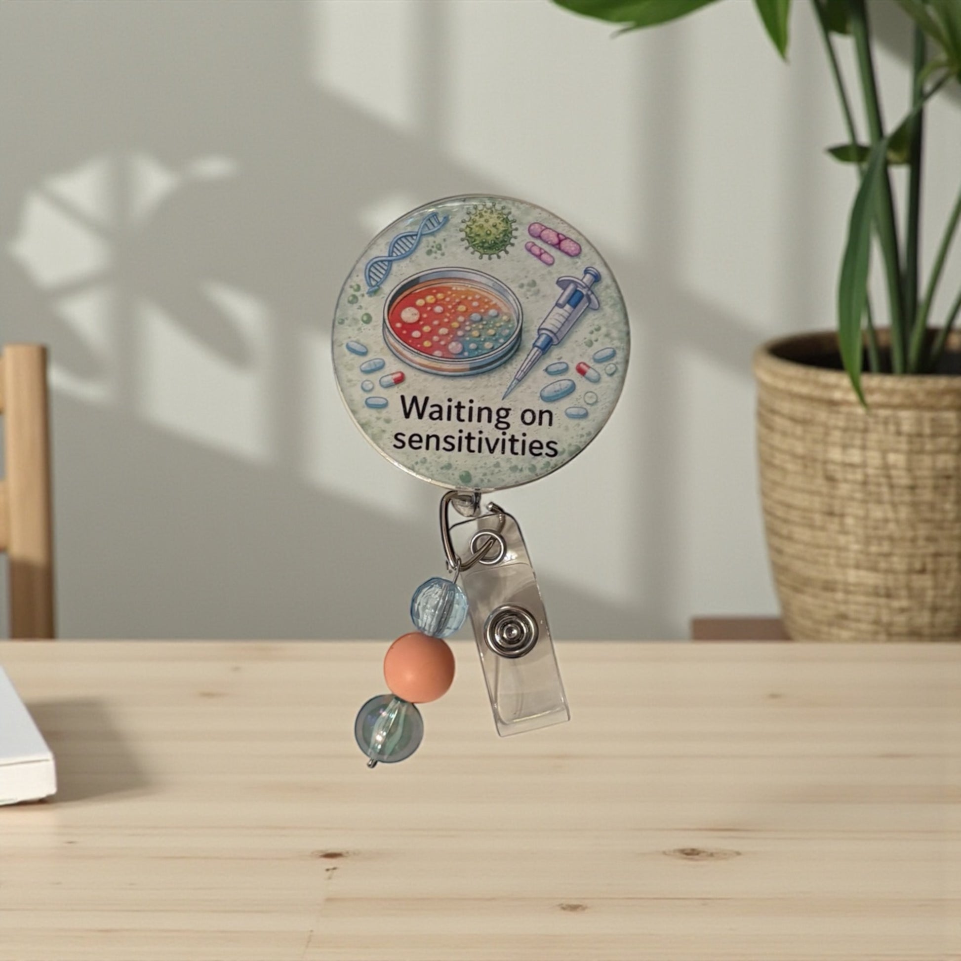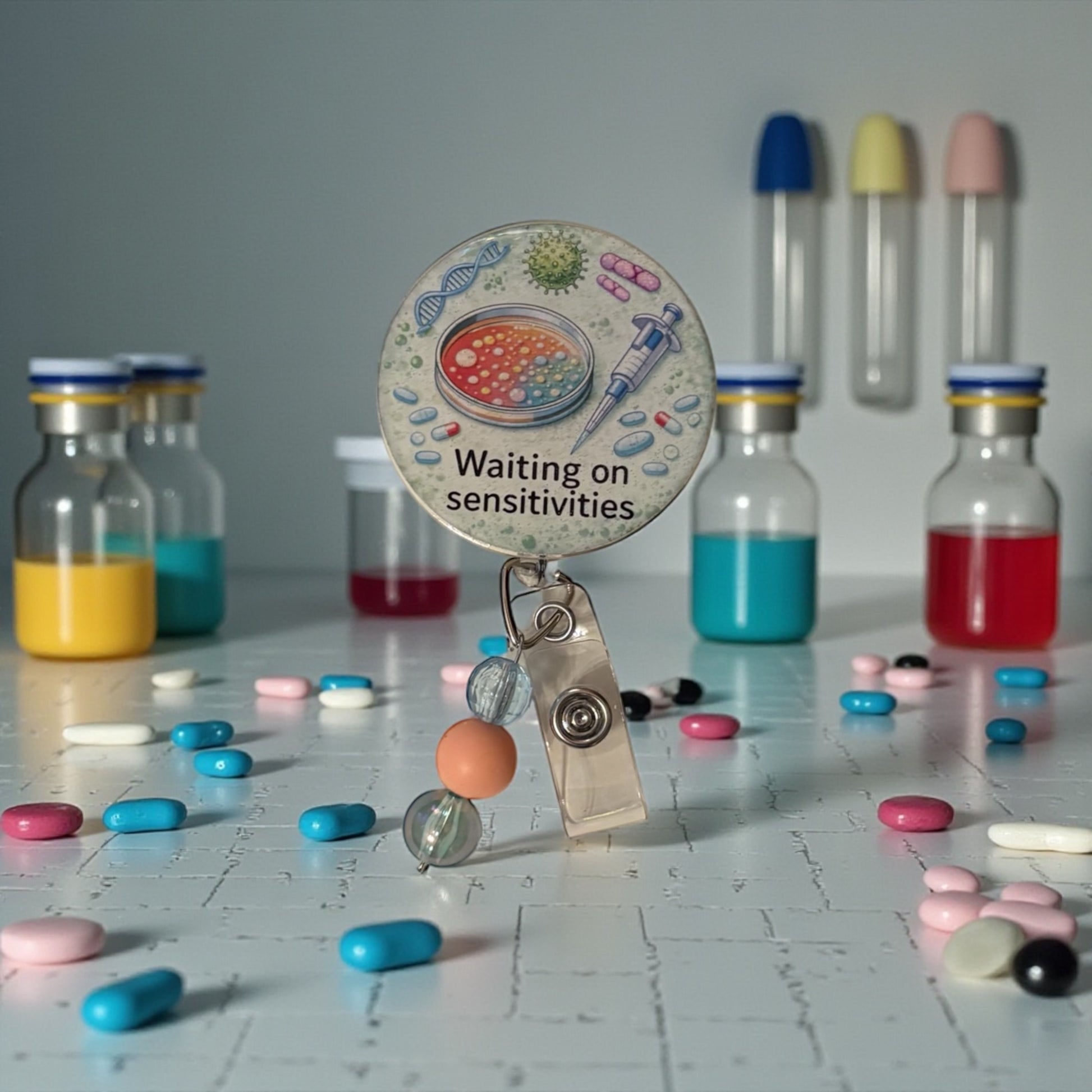 This Infectious Disease–themed badge reel features a detailed microbiology design with a petri dish, syringe, and organisms—paired with the phrase “Waiting on sensitivities.” Because nothing defines ID life quite like refreshing the chart and practicing patience.