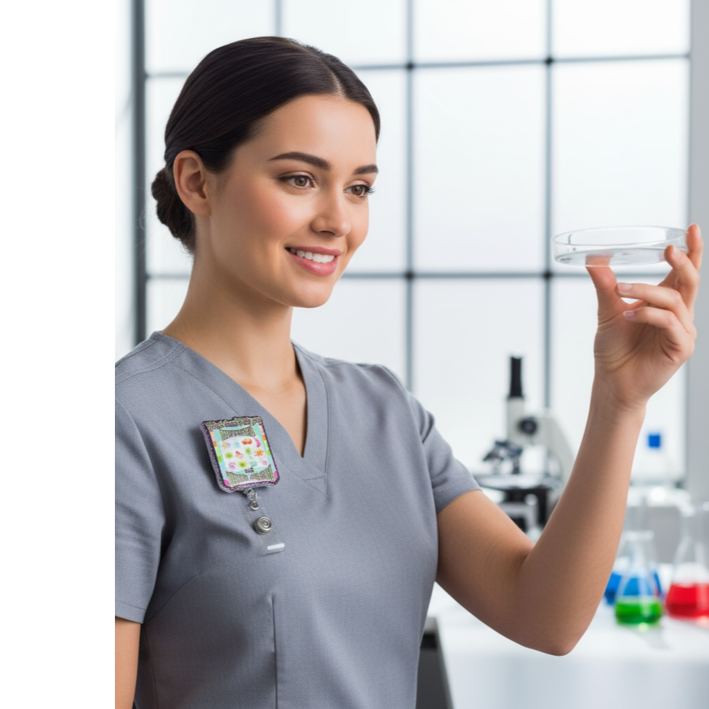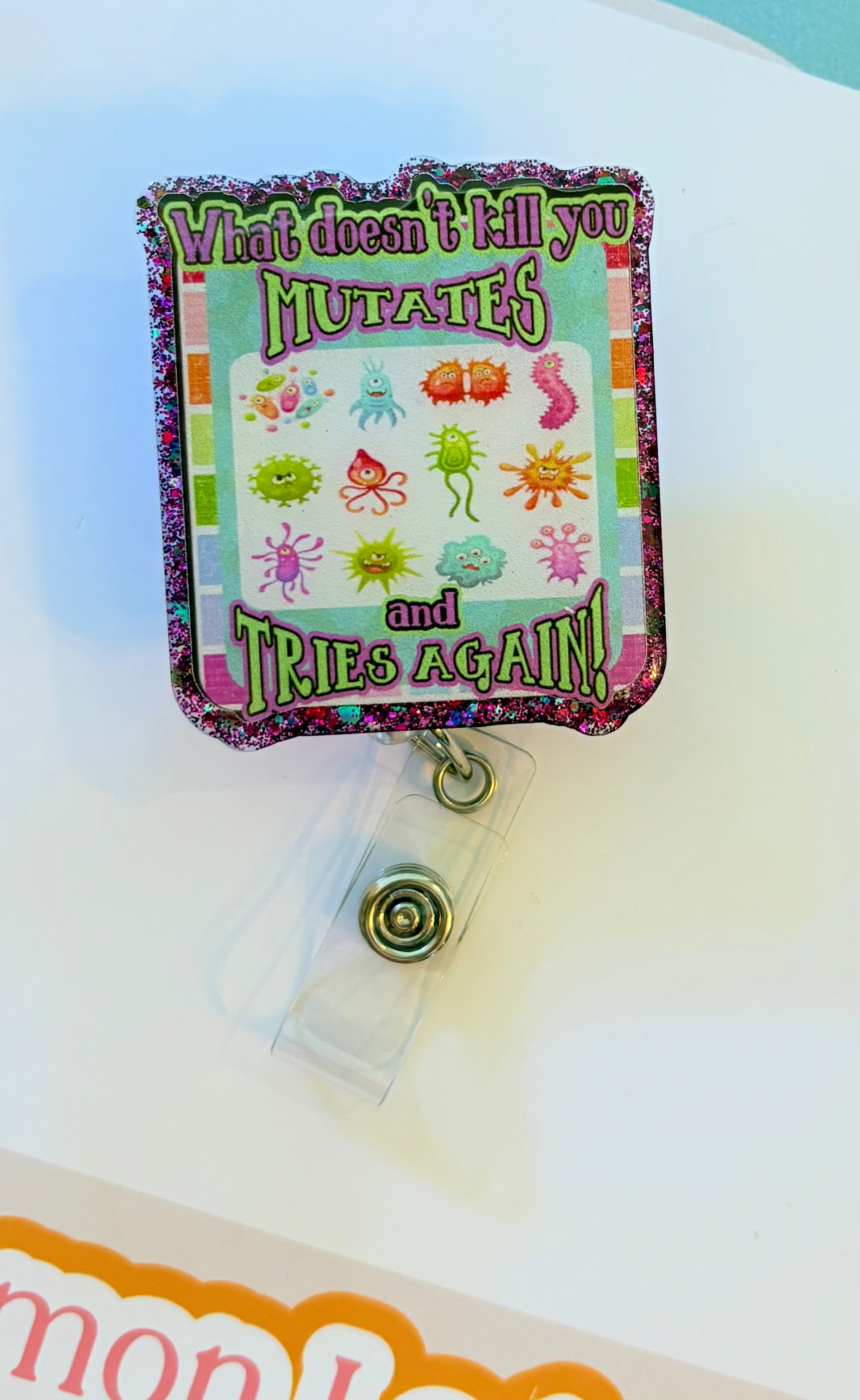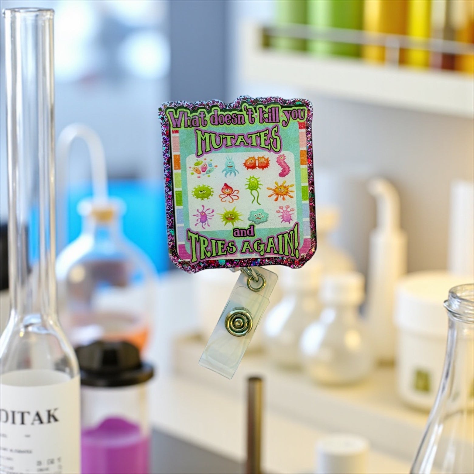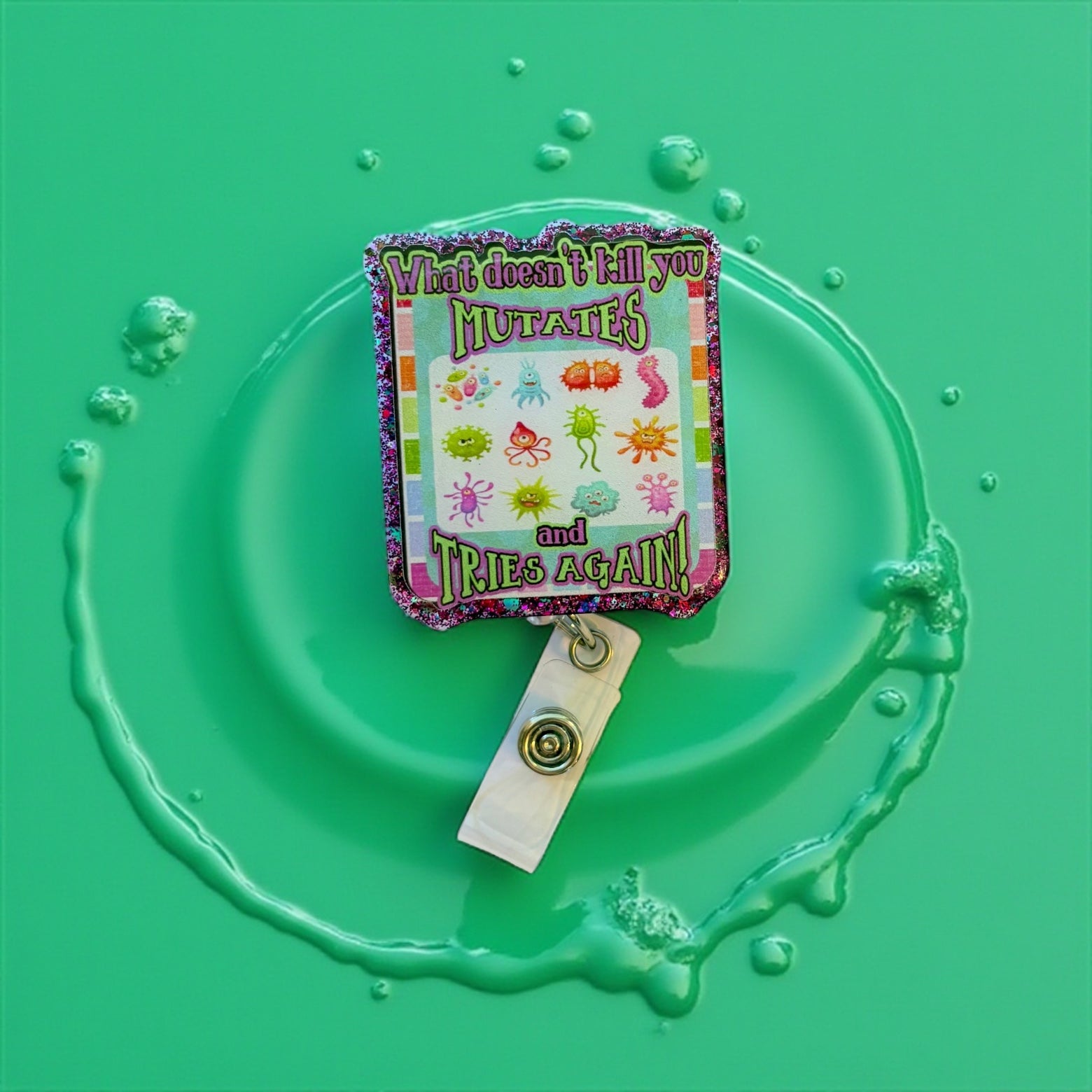 Add some infectious humor to your shift with this “What Doesn’t Kill You Mutates and Tries Again” badge reel. Featuring colorful cartoon germs with a glittery border, it’s the ultimate badge accessory for nurses, doctors, lab techs, infection control staff, and anyone who deals with bugs (the microscopic kind).